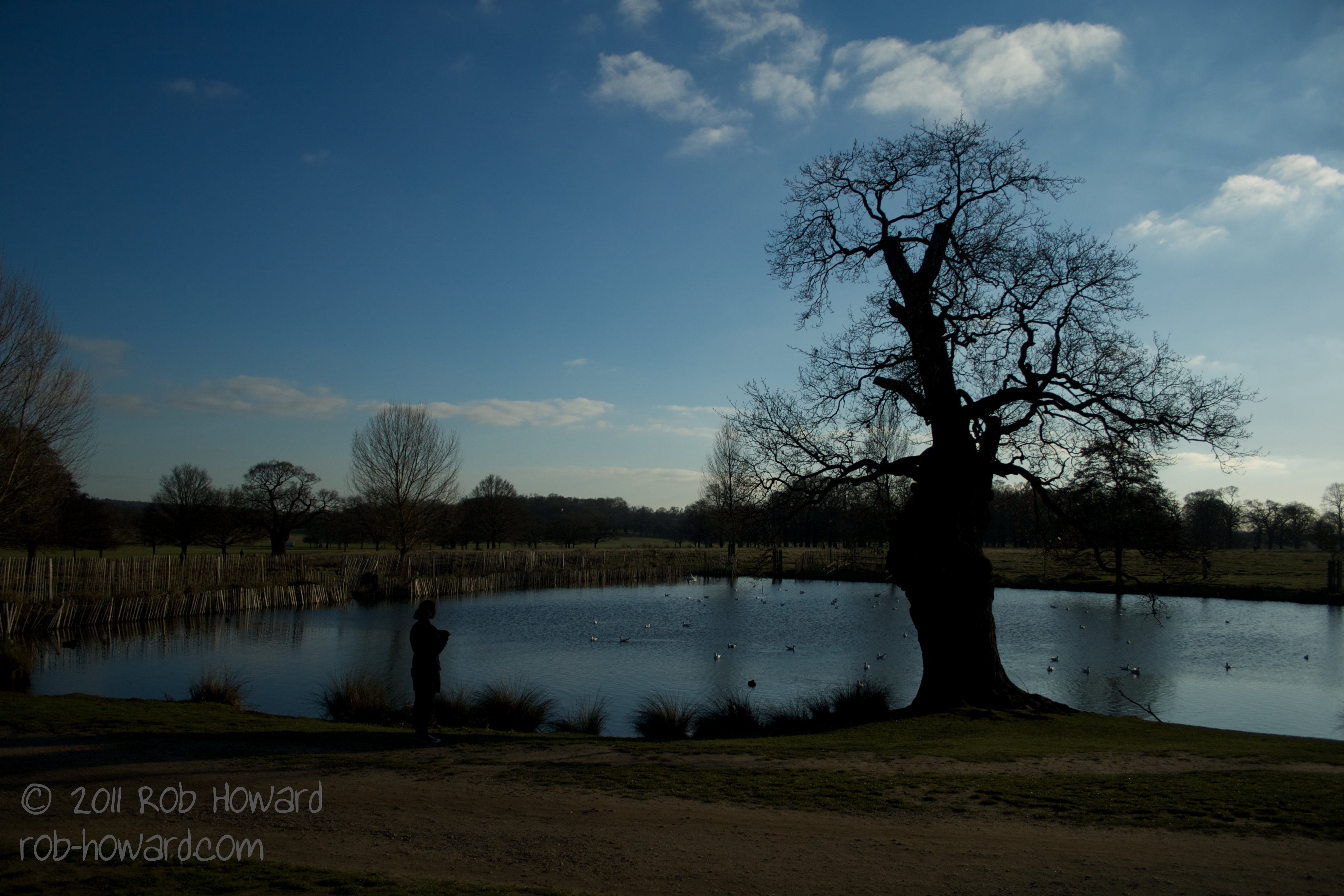 A wide shot of the duck pond, capturing the clouds on the winter sky.