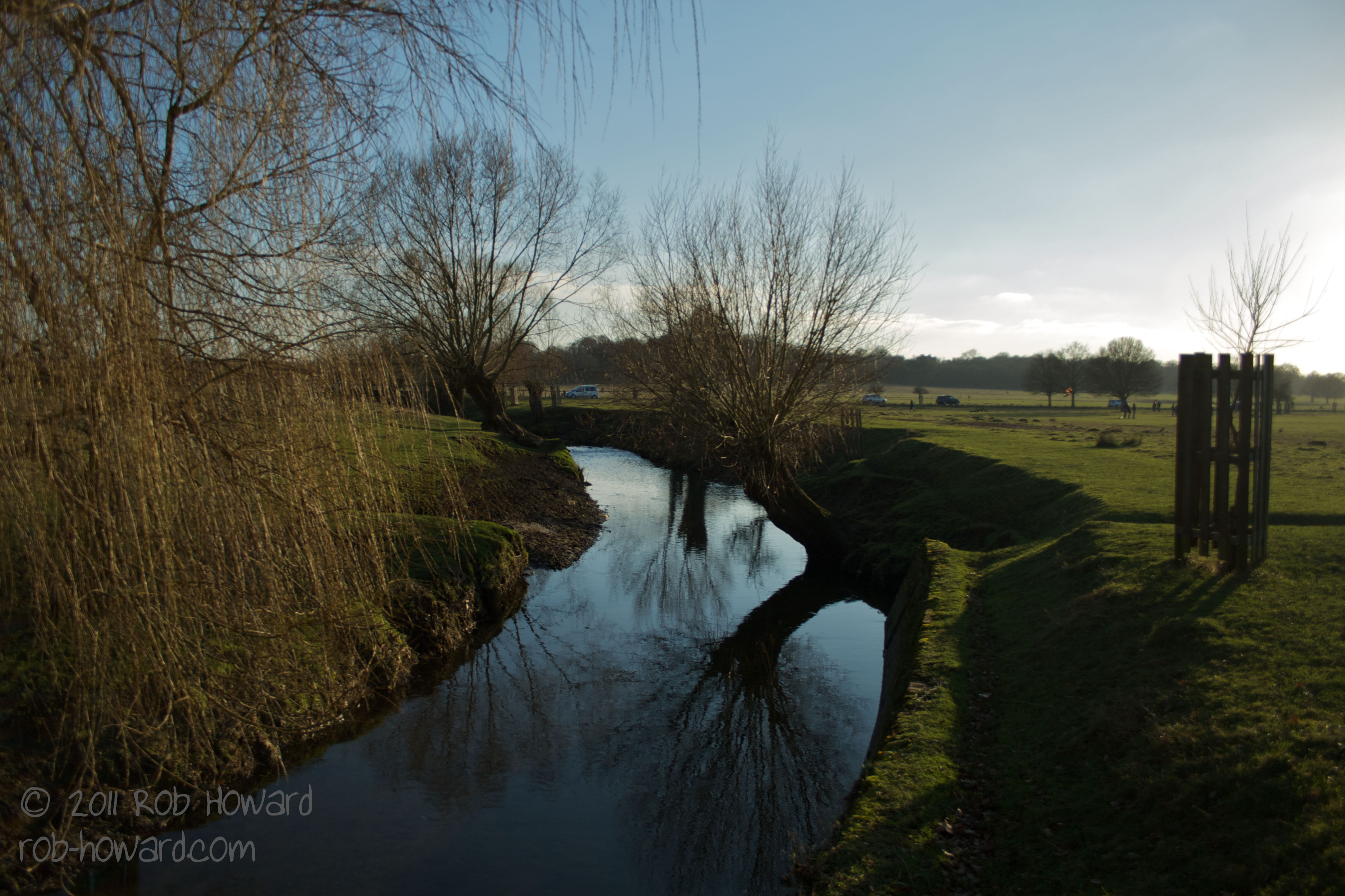 Riding over a bridge, I spotted another one of those spindly trees against a winter sky reflected in the water shots.