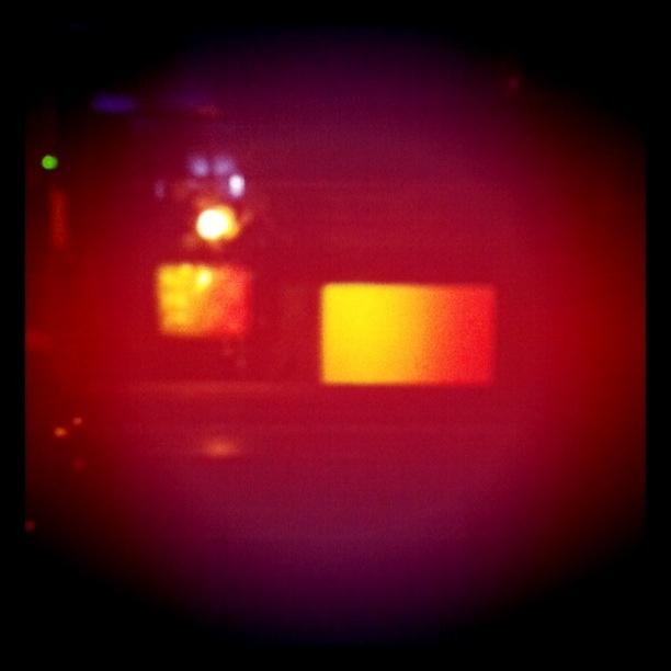 A shot of the 16mm projector at work, with the reflection of the projected image both on the glass, and on the screen.