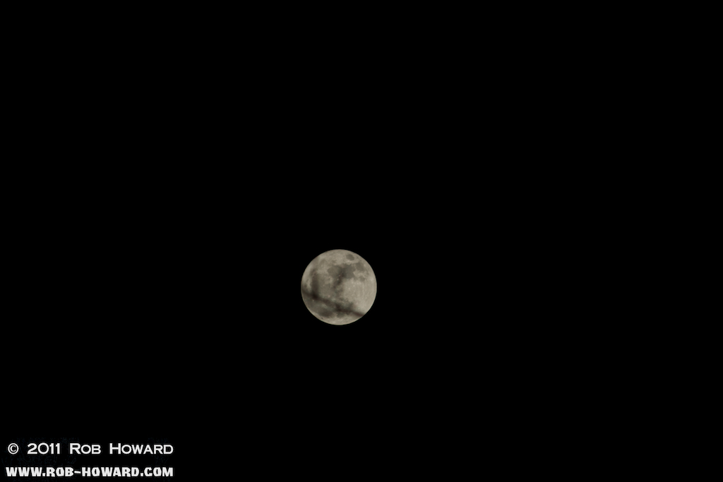 The moon disappears behind some trees.