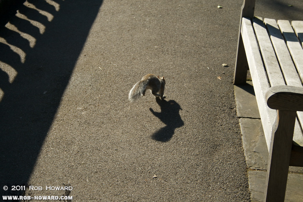 The squirrel, although tame, still runs off when he discovers we have no food to offer him and only make mysterious, shutter-like noises.