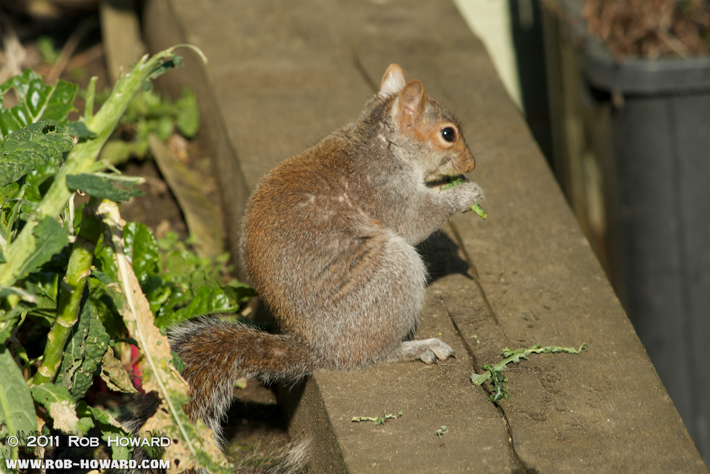 A squirrel enjoys a snack. This was at an allotment in the gardens, which was being raided by about four or five squirrels.