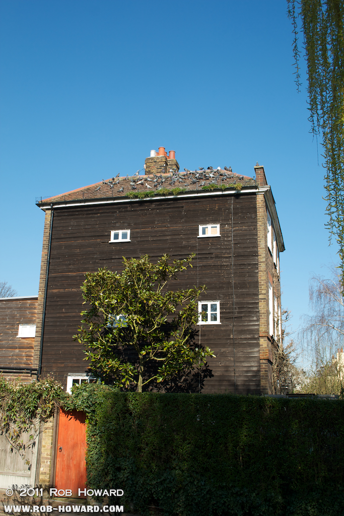 Shades of Alfred Hitchcock as a large swarm of pigeons sit atop the roof of a building.