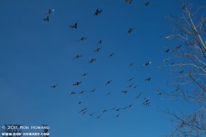 Something startled the birds (it wasn’t me, if it was I’ve have been ready to snap them taking off). Here they fly overhead, and I managed to catch most of them with their wings spread.