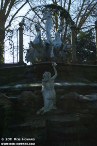 A naked statue reaches up to another naked statue, flanked by a couple of mad-looking horses.