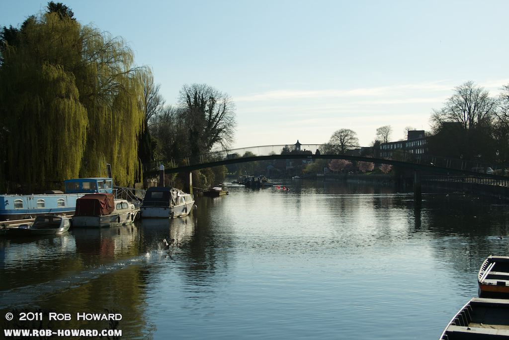 A duck (or goose) takes flight along the river, hitting the water as it goes.