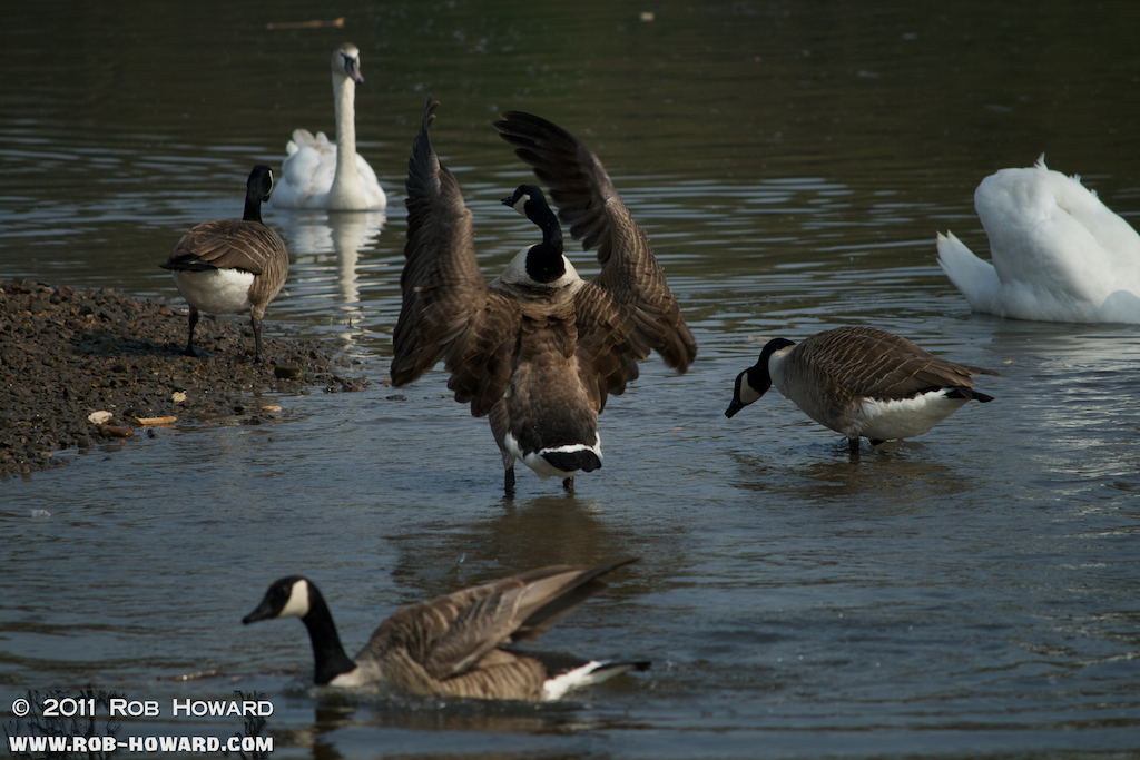 This goose continues his display as other geese – and a swan – watch on.