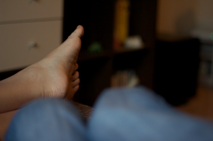 One of the reasons I bought the EF 50 mm f/1.8 II lens was to play about with the really narrow depth of field such a wide aperture can create. This is best shown in this picture of my wife’s feet, in which my legs in the foreground and a bookcase in the background are nicely blurred whilst the feet are (reasonably) in focus.