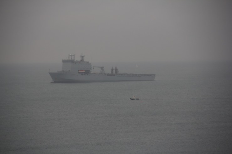 Having returned to our hotel to dry off and change, it was announced that they hoped to have a few displays in the evening as the weather had improved slightly, so we headed back out. Unfortunately, whilst standing around waiting for them to start, a mist started descending and a small amount of drizzle started falling. Barely five minutes before the flying was due to begin, it was called off. I can’t really blame them, this is the view of the RFA Mounts Bay that was moored out in Poole Bay for the event: