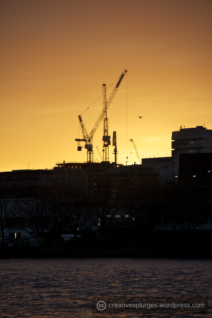 A few cranes surround a building site, preparing for the day’s work.