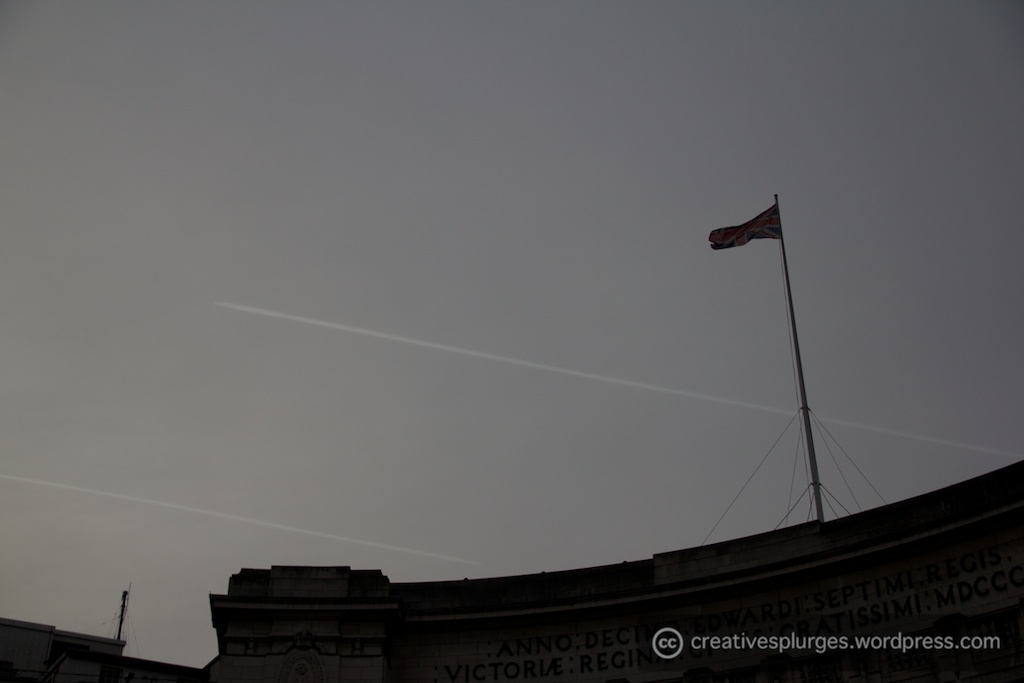 The Union Flag flies over Admiralty Arch, as an aircraft flies even higher.