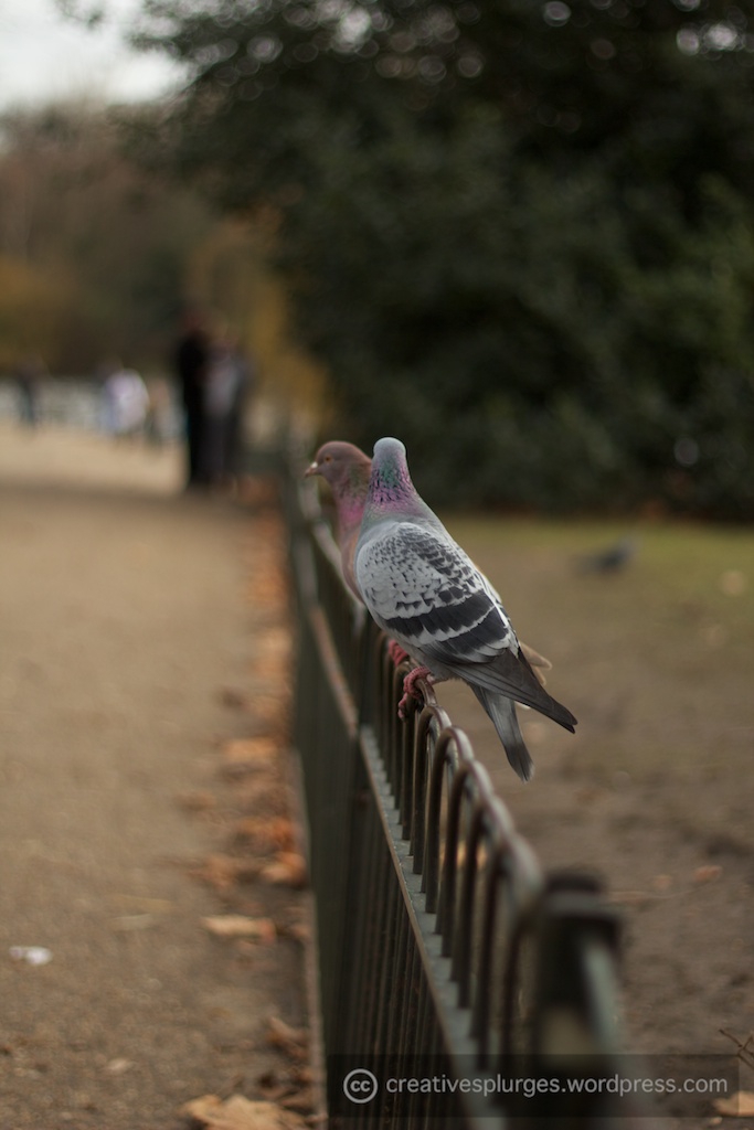 A pigeon looks disapprovingly at one of the tourists in the background.