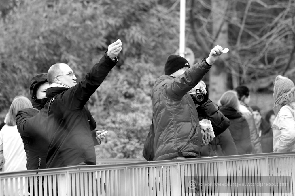 Two tourists offer crisps to seagulls, as their partners stand ready with cameras to capture the moment they lose a finger.