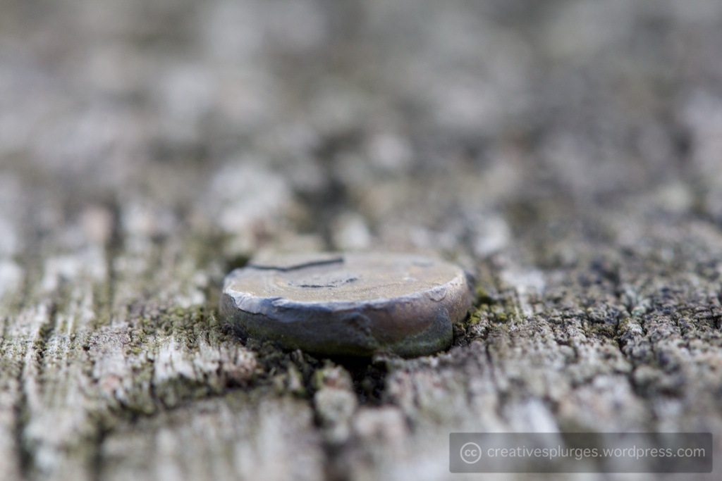 I closed up the aperture a little for that photo; in my first attempt the depth of field was a little too shallow. I then came along a bench, made of old, well-weathered wood, held together with a few nails.