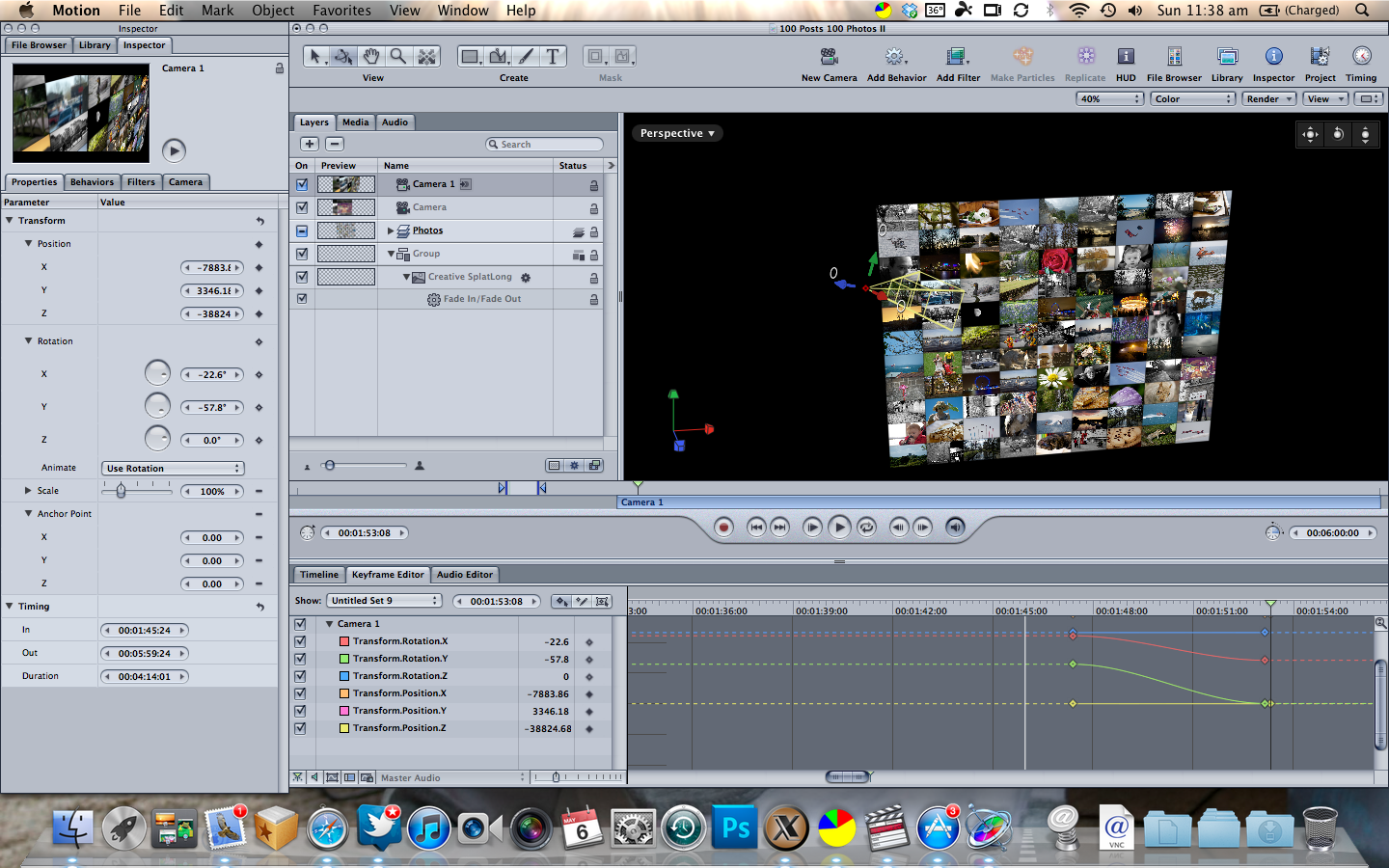 Unfortunately, I’m not the sort of person who can just set a few photographs to music and call it a day. I have to show off a little – especially since I’m technically qualified in motion graphics software. I began working on something to display my photos with a little more flair. This quickly turned into a far bigger project than I first envisioned. I had originally conceived a few photos flying about on screen. As I sat down to build the video in Apple’s Motion software this developed in short order to having a single image tessellate into a wall of ninety-nine photos, with sweeping camera views and zooms.