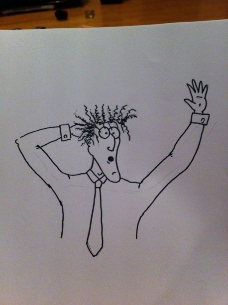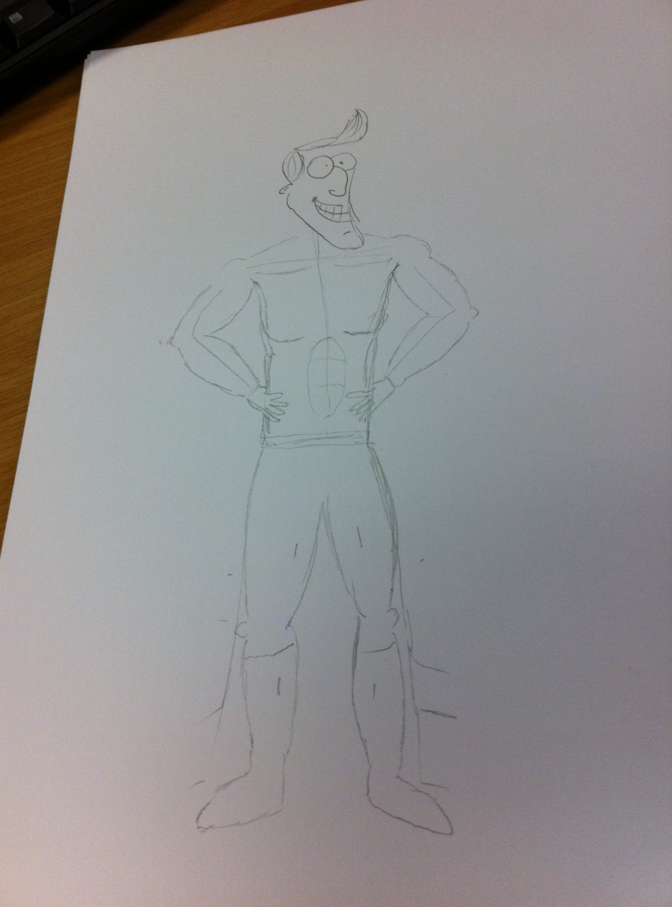When it comes to drawing, one thing I am not is consistent. The only characters I’ve ever been able to draw reliably – all, I should add, part of the Harry canon – have been simple and therefore easily repeatable. Mr Supremo is far more of a character than anything I’ve really drawn before (mainly because he was created and described by Holly, who has a vivid imagination) which made him difficult to repeat. The second drawing was created on paper again, this time by tracing the first image, but repositioning his arms and putting him in a shirt. I then inked it as I did the first.
