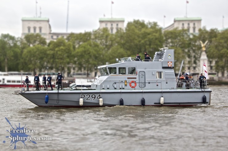 Whilst we were waiting for the boat, a couple of small navy boats stopped near our pier. I guess they were doing some kind of manoeuvring or training for the Olympics or the Jubilee River Pageant. I took a shot of one of them and decided to try to create a tilt-shift style image using the blur tool.