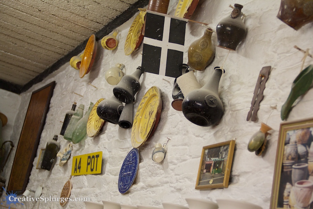 The workshop was brilliant. Every flat surface had pottery of some sort on it, there was nice old wooden shelves, and here and there were eclectic items, just because. Here, some jugs awaiting a second firing.