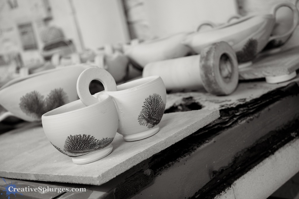 I really liked the non-glossy look of the non-quite-fully-fired pottery. In fact, they also sell posts without the final glaze on, which gives a rougher yet more rustic finish. The coffee mug I bought was in this style.