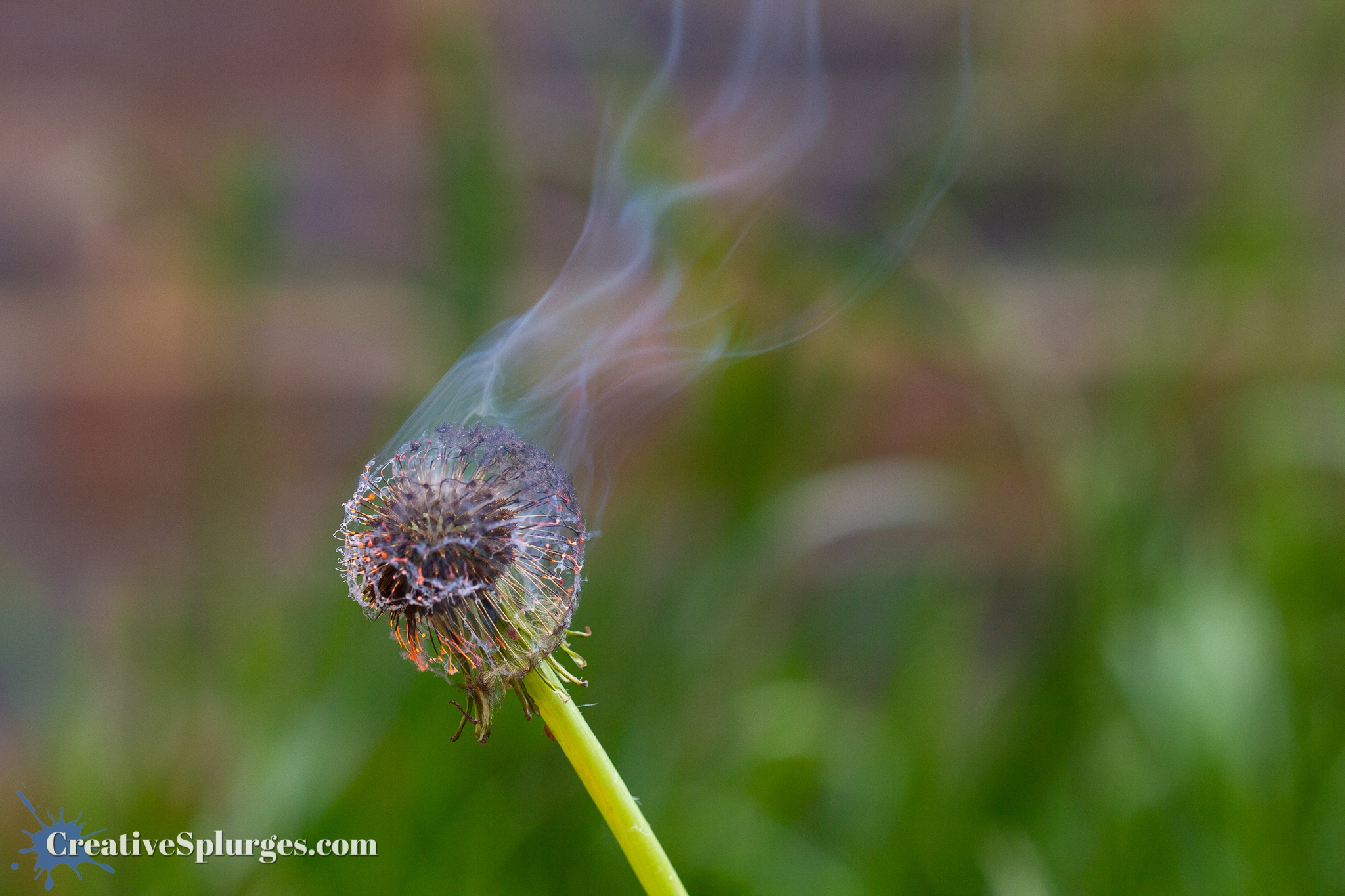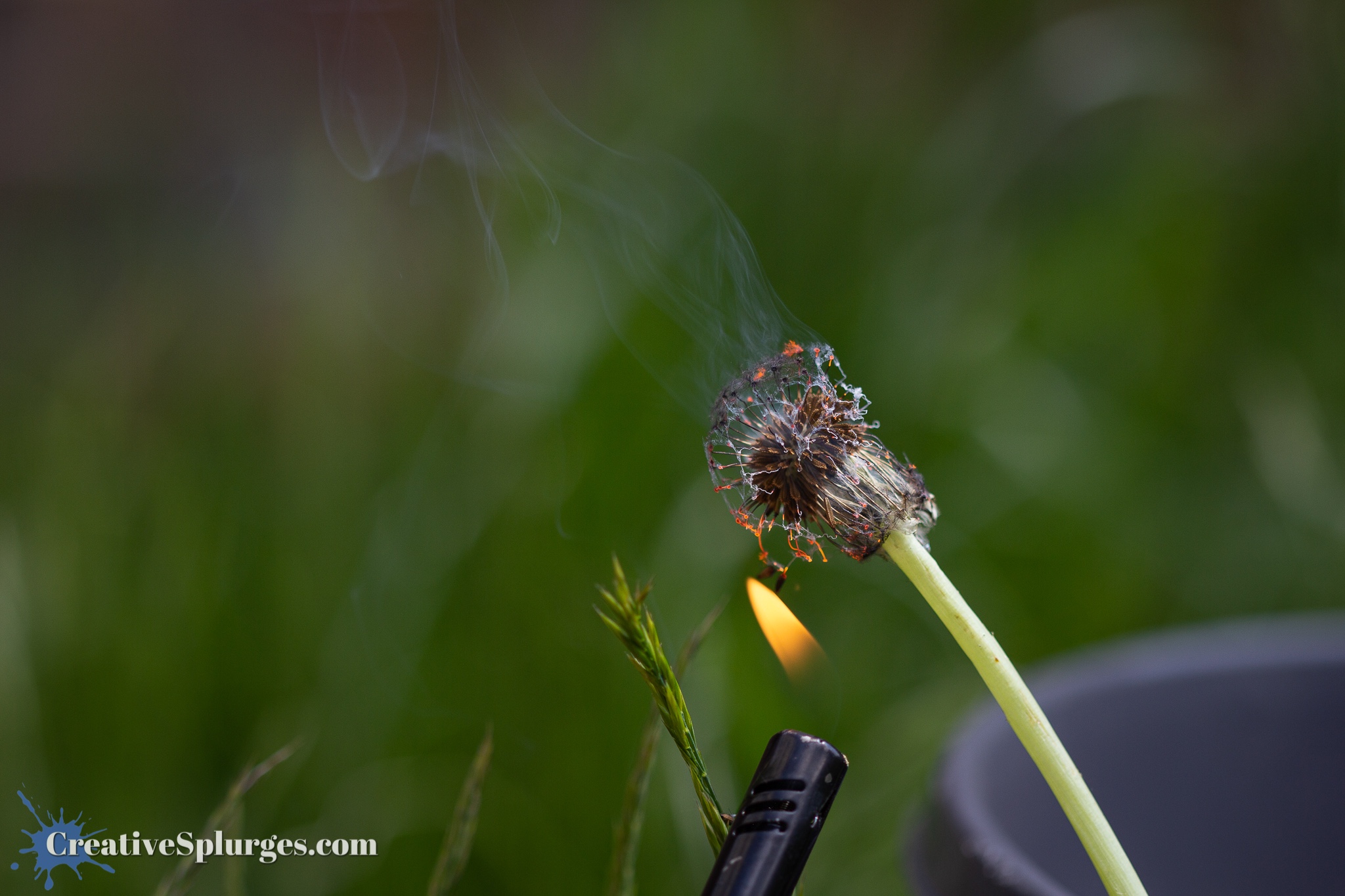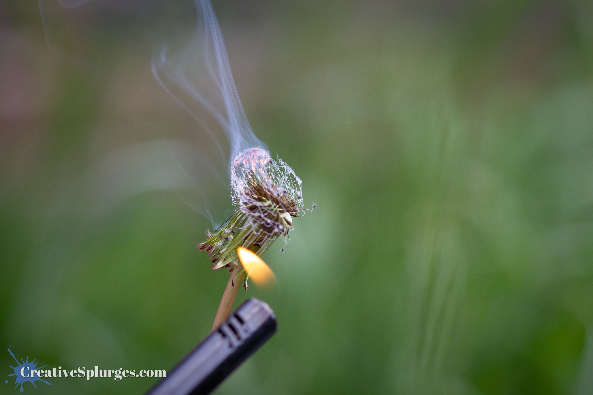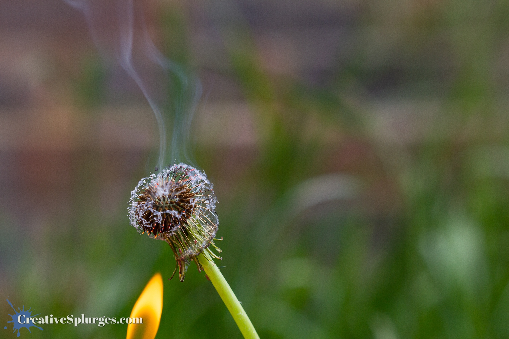 The plan was relatively simple. Set my camera up on a tripod with my 100mm macro lens, clamp a dandelion in the right spot, set the camera to burst mode, and use my remote cable to fire off as many shots as the camera can do for the second or so that it takes for the dandelion to burn.