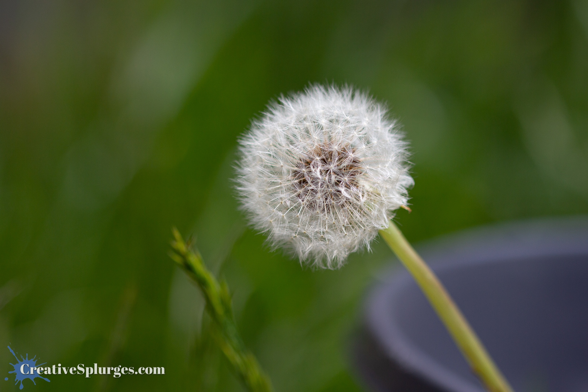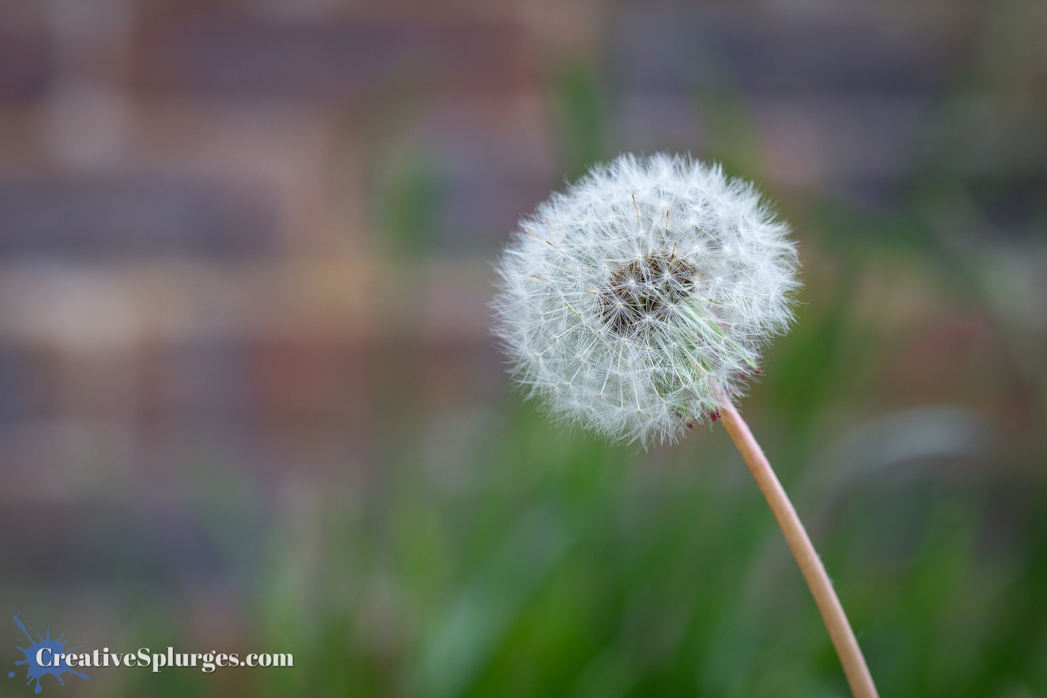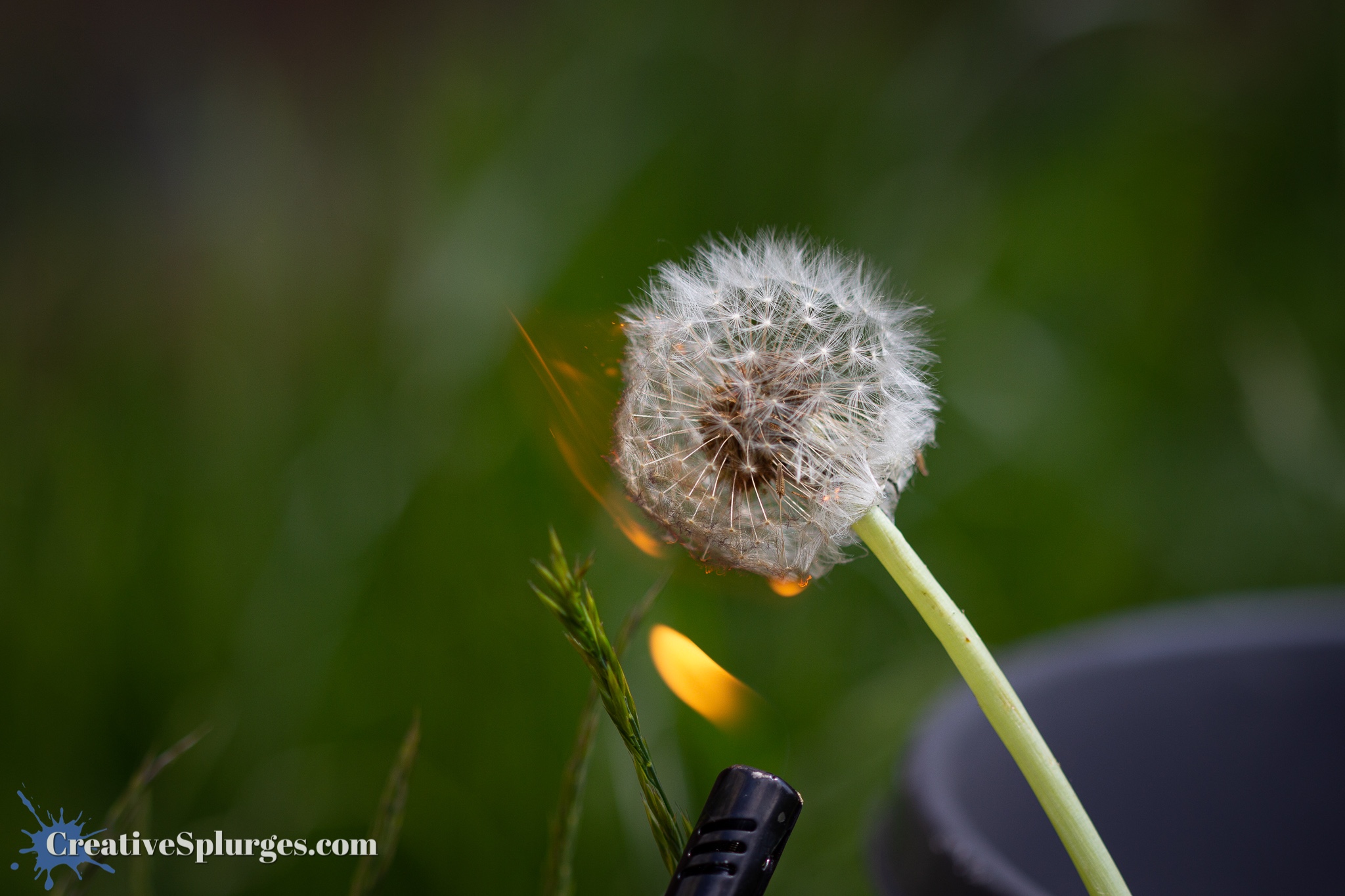 My next dandelion had a stronger stem so I could get the bucket out of frame. That said, I managed to position it so high it was above the grass and you can make out my garden wall in the background. I also closed up the aperture from f/2.8 to f/5 to make sure I was getting more of the dandelion in focus.