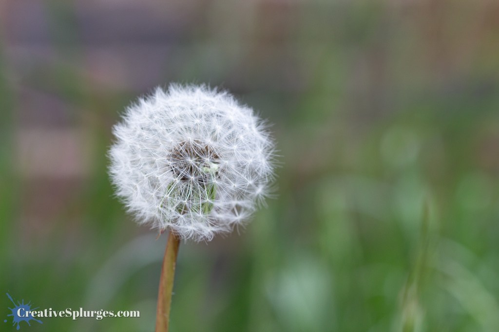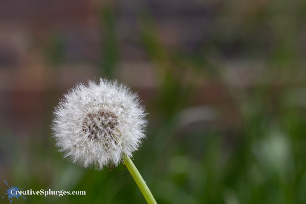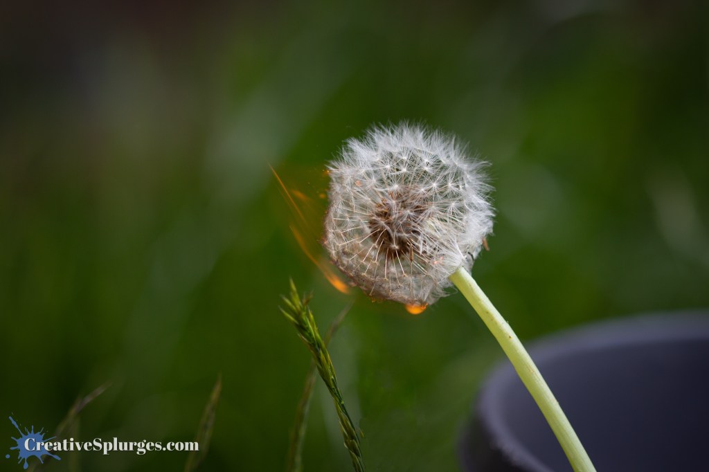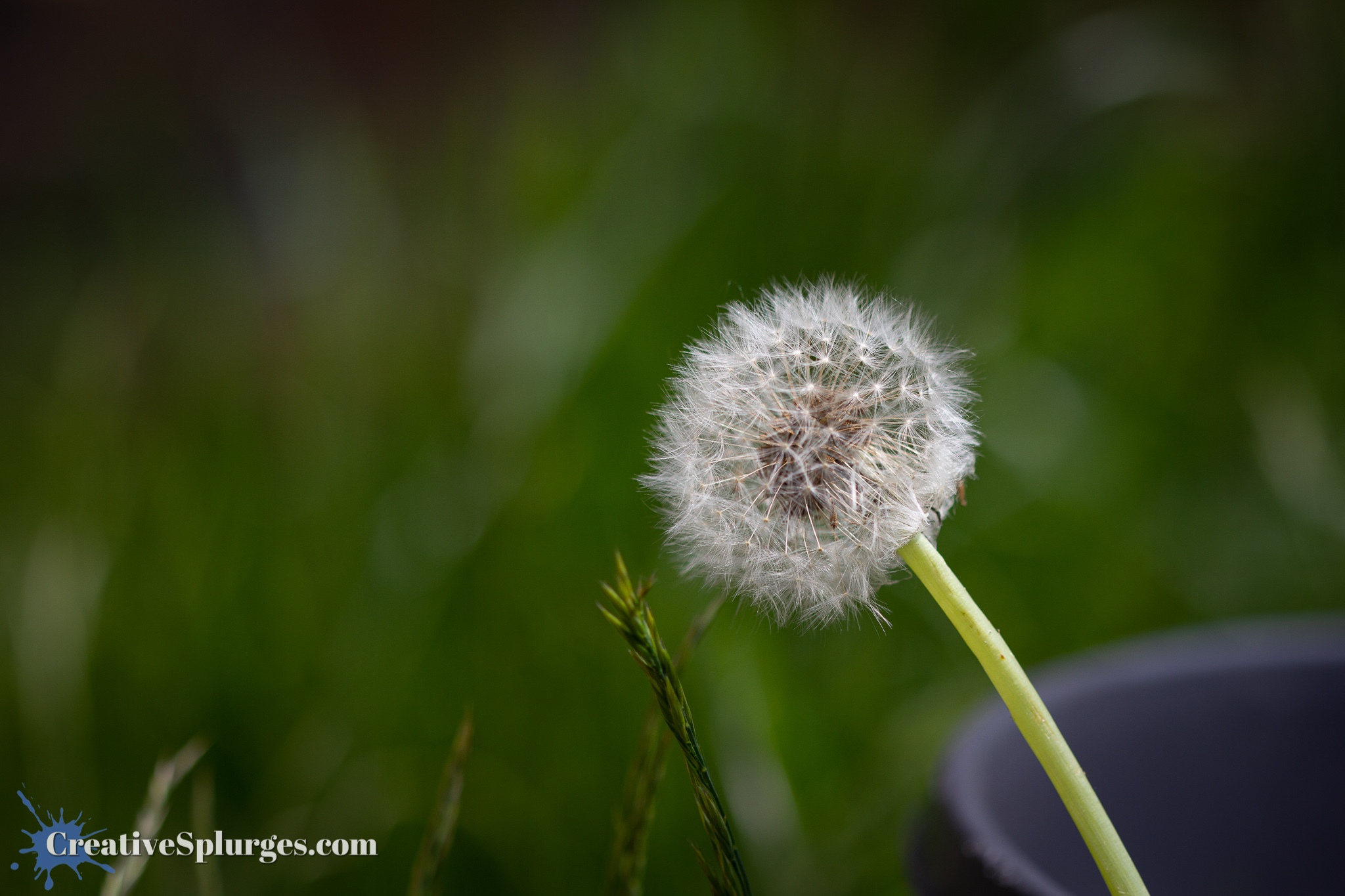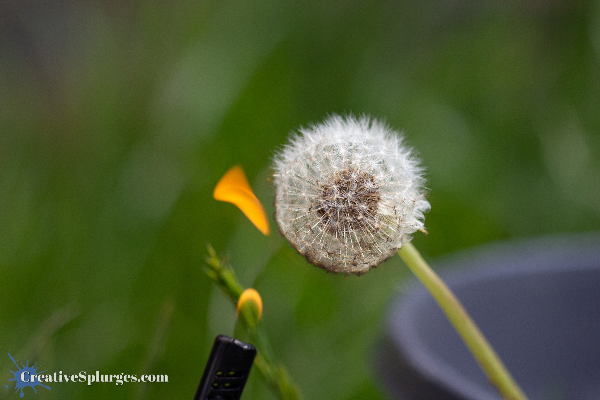My next dandelion had a stronger stem so I could get the bucket out of frame. That said, I managed to position it so high it was above the grass and you can make out my garden wall in the background. I also closed up the aperture from f/2.8 to f/5 to make sure I was getting more of the dandelion in focus.