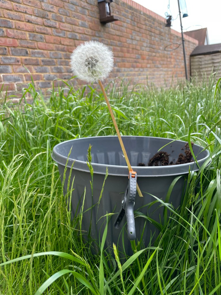 The chances of dandelions growing exactly where I wanted them was pretty slim, so I picked them, took them to a spot in our back garden, and propped them up by clamping them to a bucket.