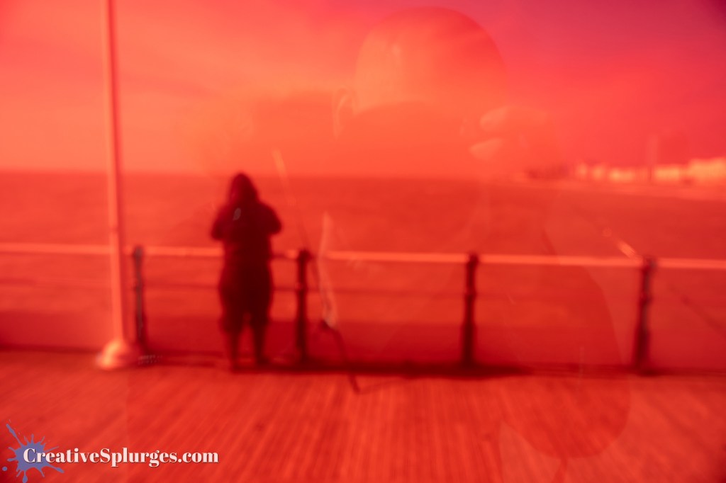 As I walked along, I saw a man fishing from the pier. Ever keen to avoid being spotted photographing someone, and looking for something a bit more different, I took a picture of him through one of the coloured panes of glass.