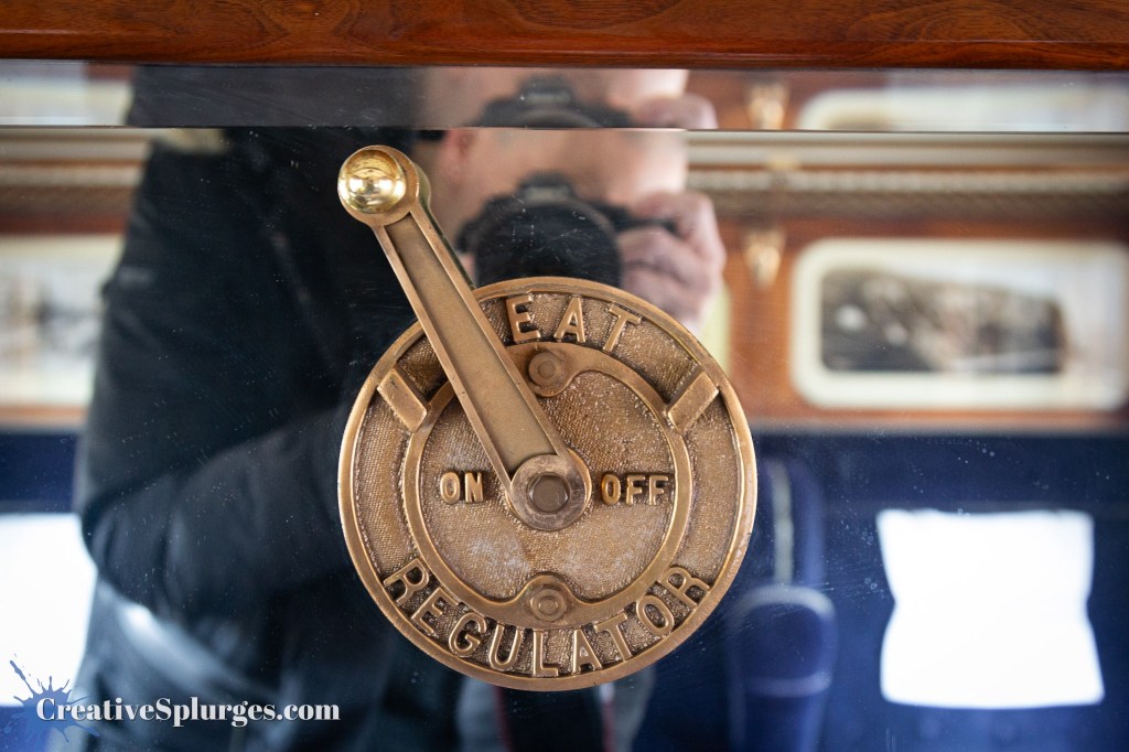 On the carriage we travelled on was a lovely old heat regulator valve, which made for the sort of interesting, textured images that I’m often partial to. It was, however, mounted on a mirror, so for the straight-on view more eagle-eyed readers might be able to spot me.