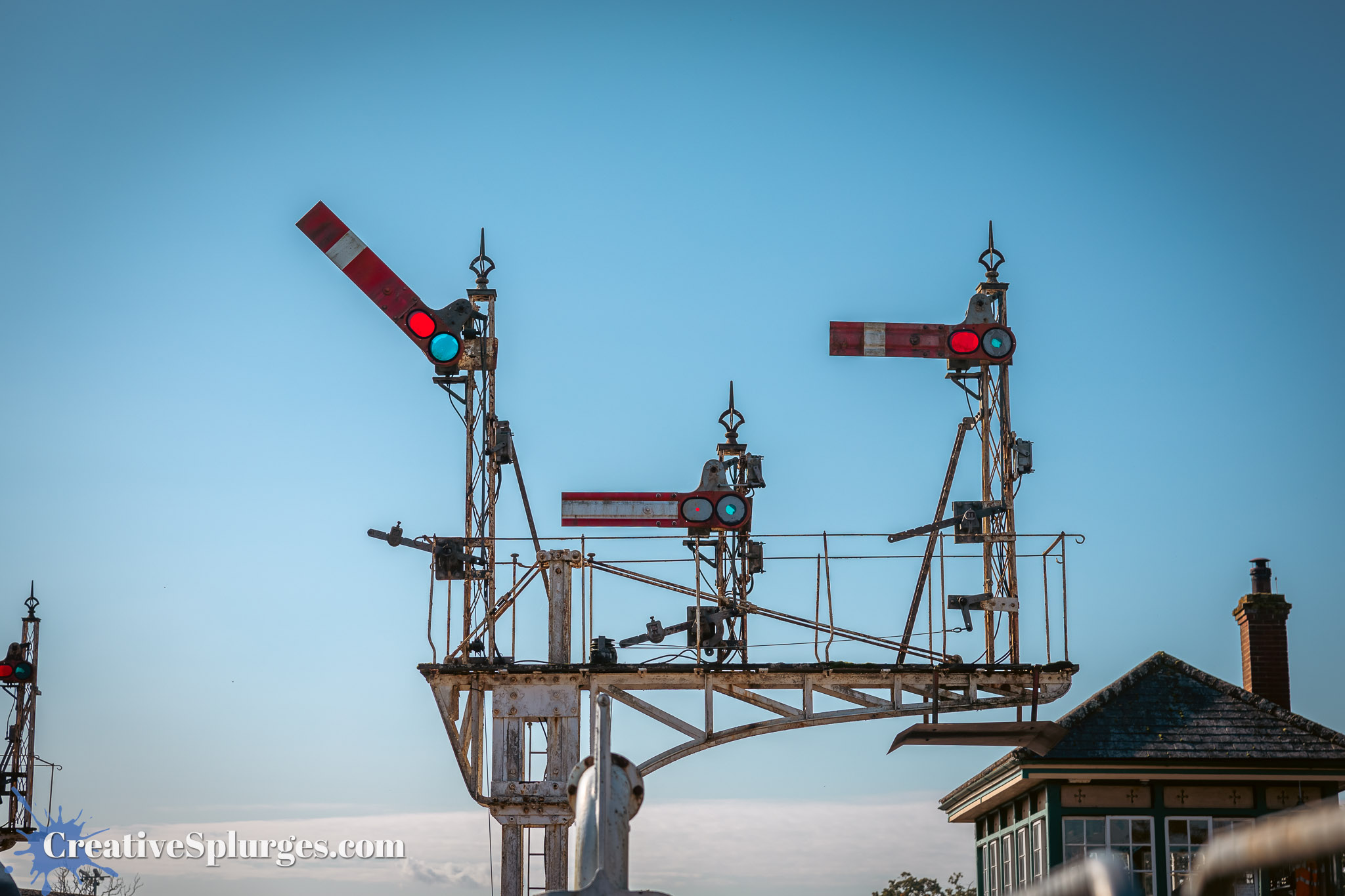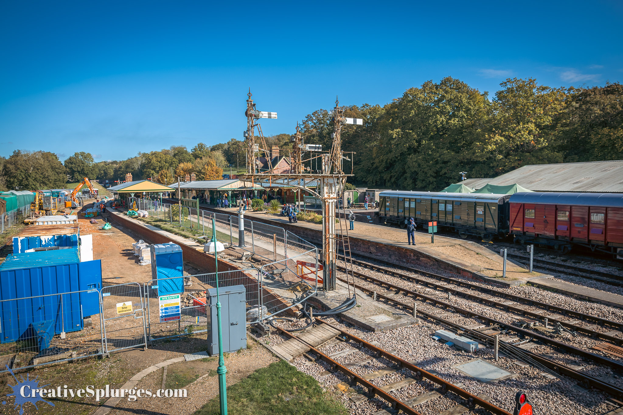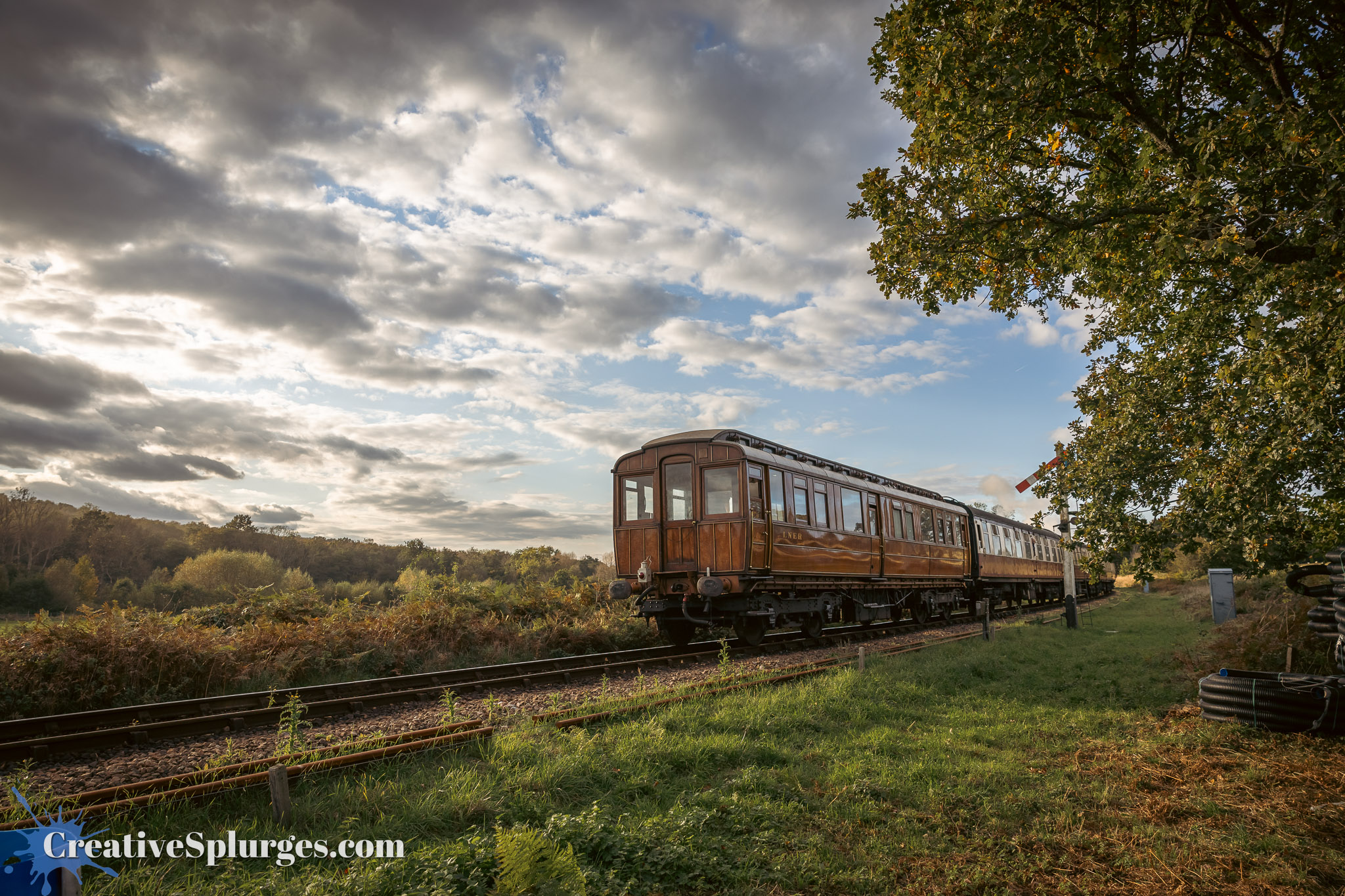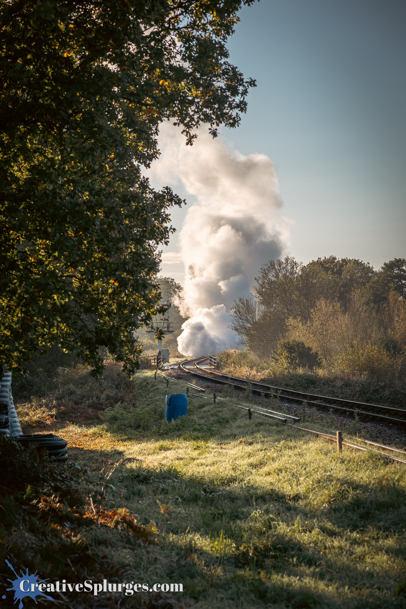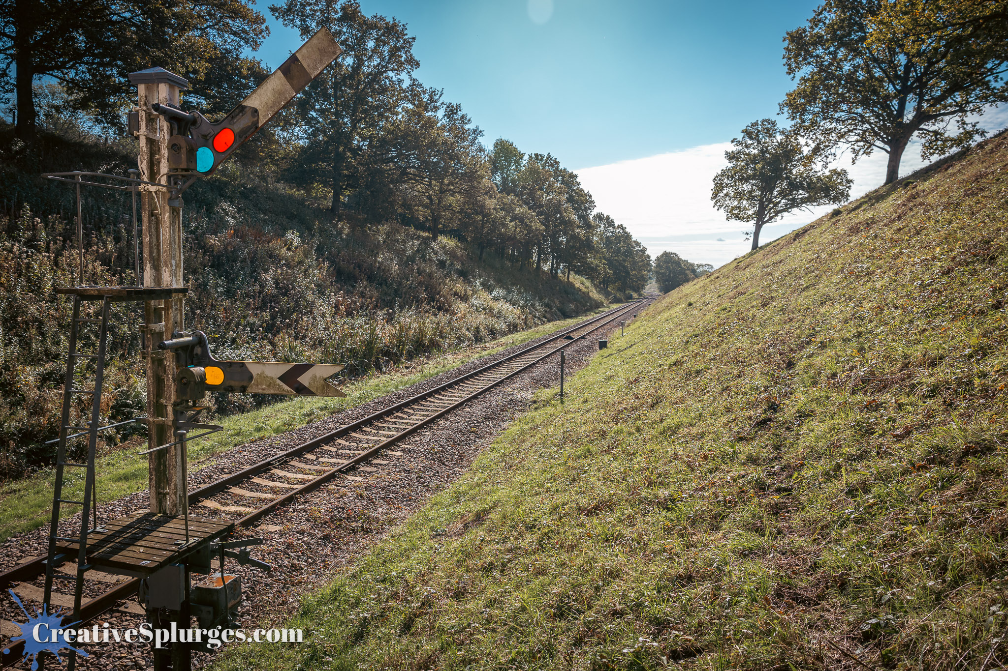 The journey to Horsted Keynes only takes 15 minutes on the train, not the four hours it took me when I made the journey on foot during the Branch Line Gala. From there it was only a short walk back south to Three Arch Bridge. Originally I had planned to include the bridge in my photos, but the trains were all coming out of the sun and so the side of the bridge I’d be shooting would be in shadow, so instead I chose to position myself under the bridge, and shoot south down the embankment. This also gave me the opportunity to include an old semaphore signal in the shot.