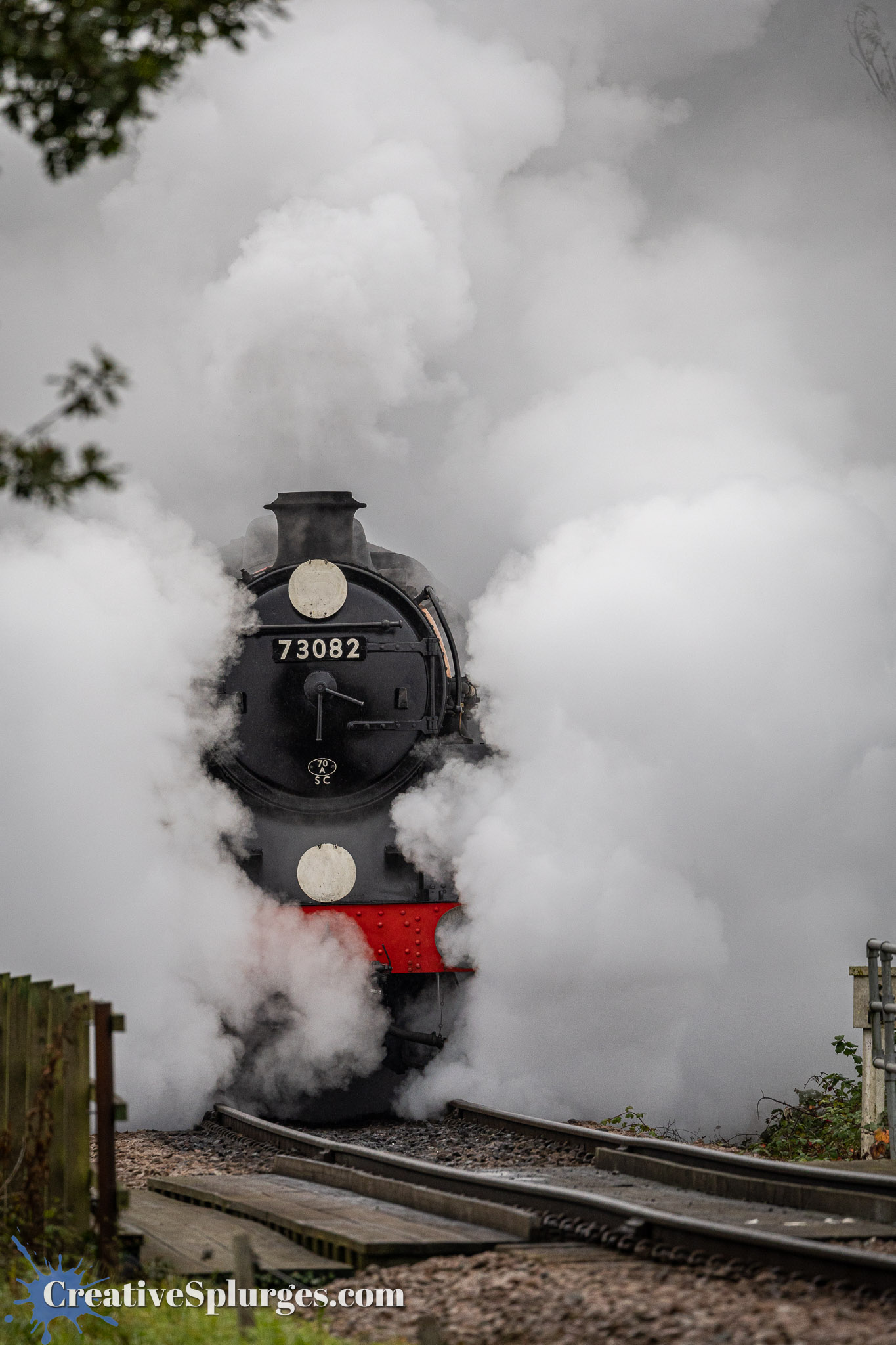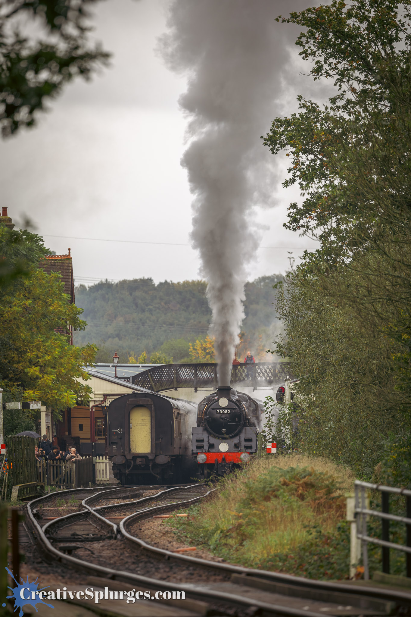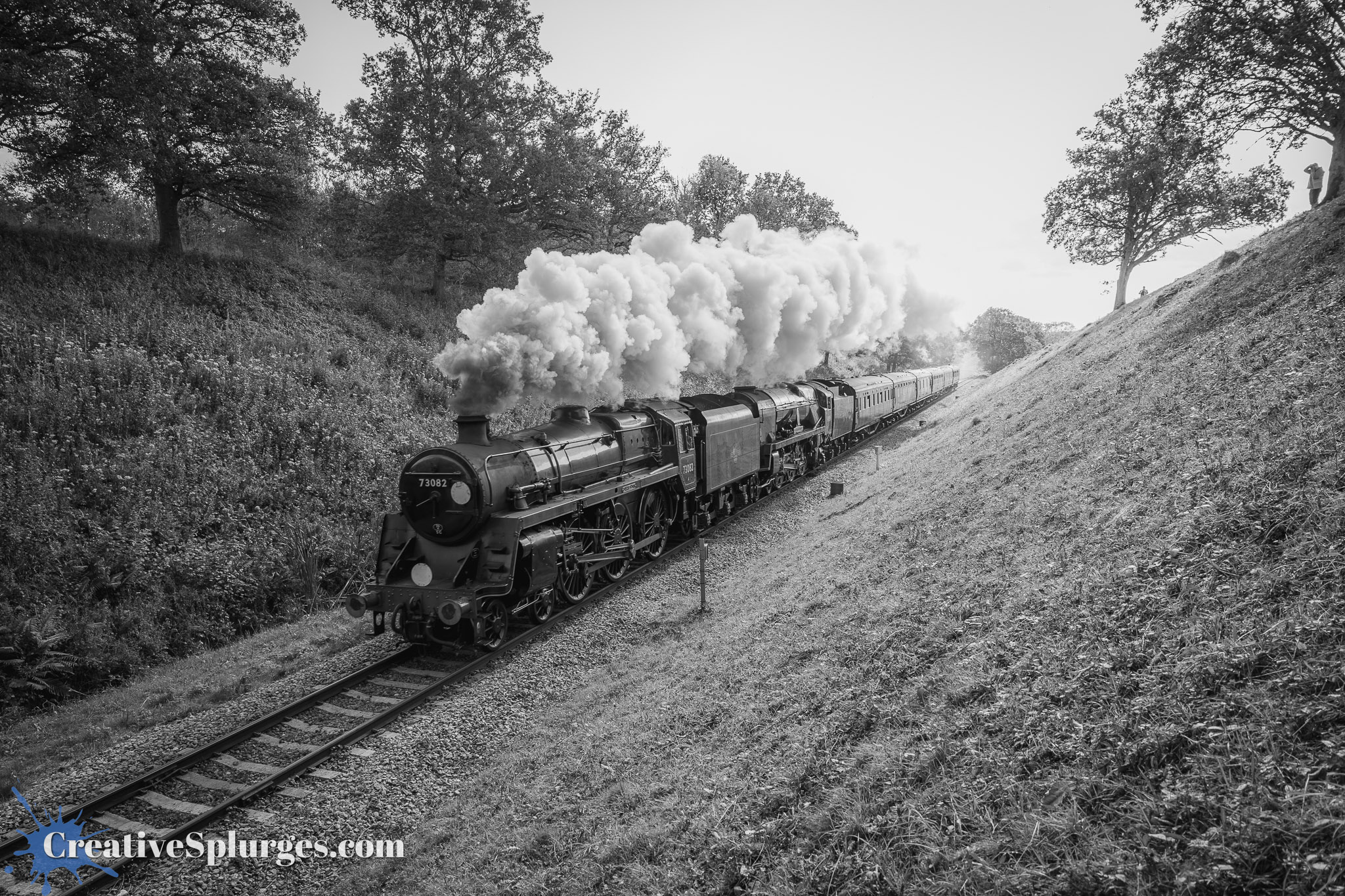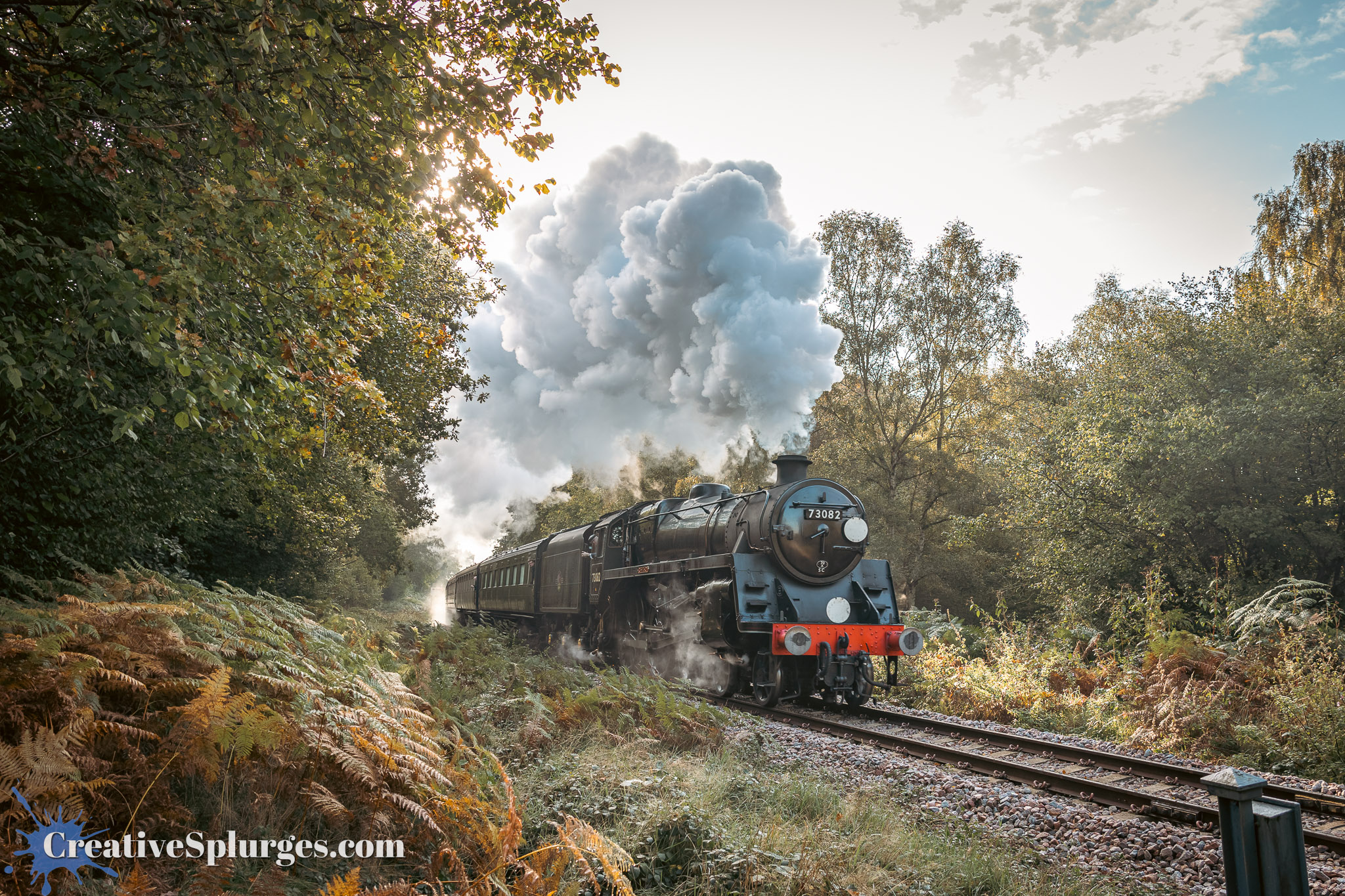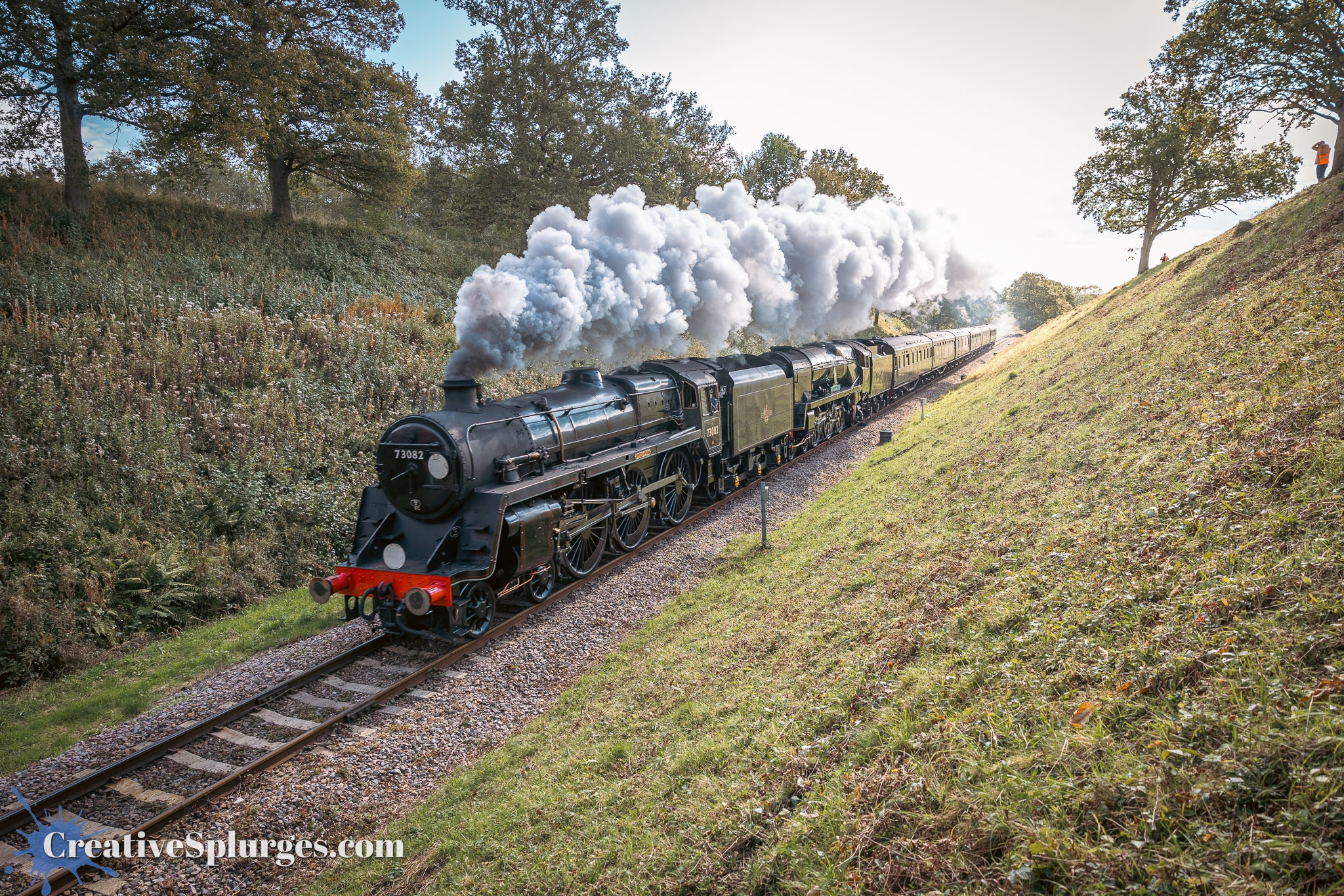 I decided to hold here for the next train. I was shortly joined by another lineside photographer, who had photographed Sir Archie’s departure from much closer to Sheffield Park. We shared the spot for the next train, which was 73082 Camelot. It turned out this was a good spot, as not only did we not have the problem of trains disappearing into clouds of steam, but as it was just past where the speed limit on the line changes and just before the incline up to Freshfield Bank, the locomotives were working a bit harder which meant the smoke coming out their stacks was impressive.