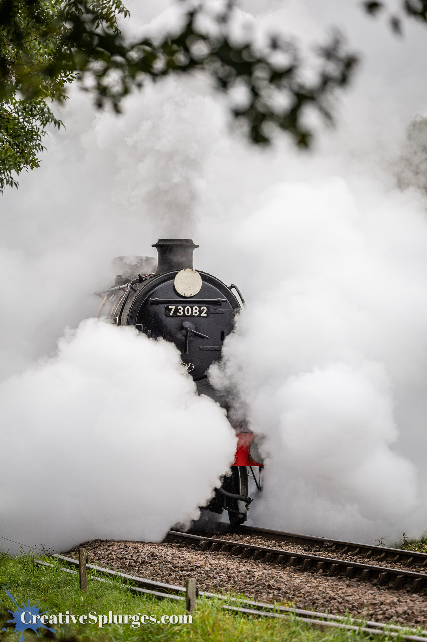 I made my way to my planned spot ready for Sir Archie to set off, a spot I intended to use for Sir Nigel Gresley a little while later. Presently Sir Archie was underway. It had a very steamy start, and as it rounded the corner towards me it was just a column of steam and smoke. For a brief moment it poked out from the steam.
