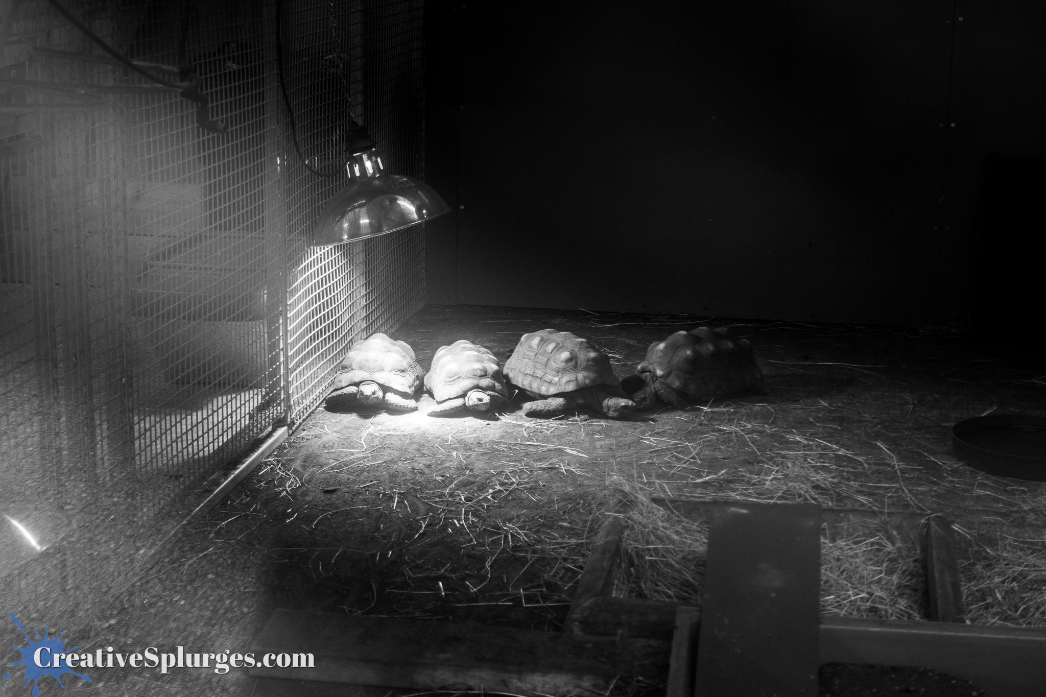In one pen a bunch of tortoises were crowding around a heatlamp for warmth.