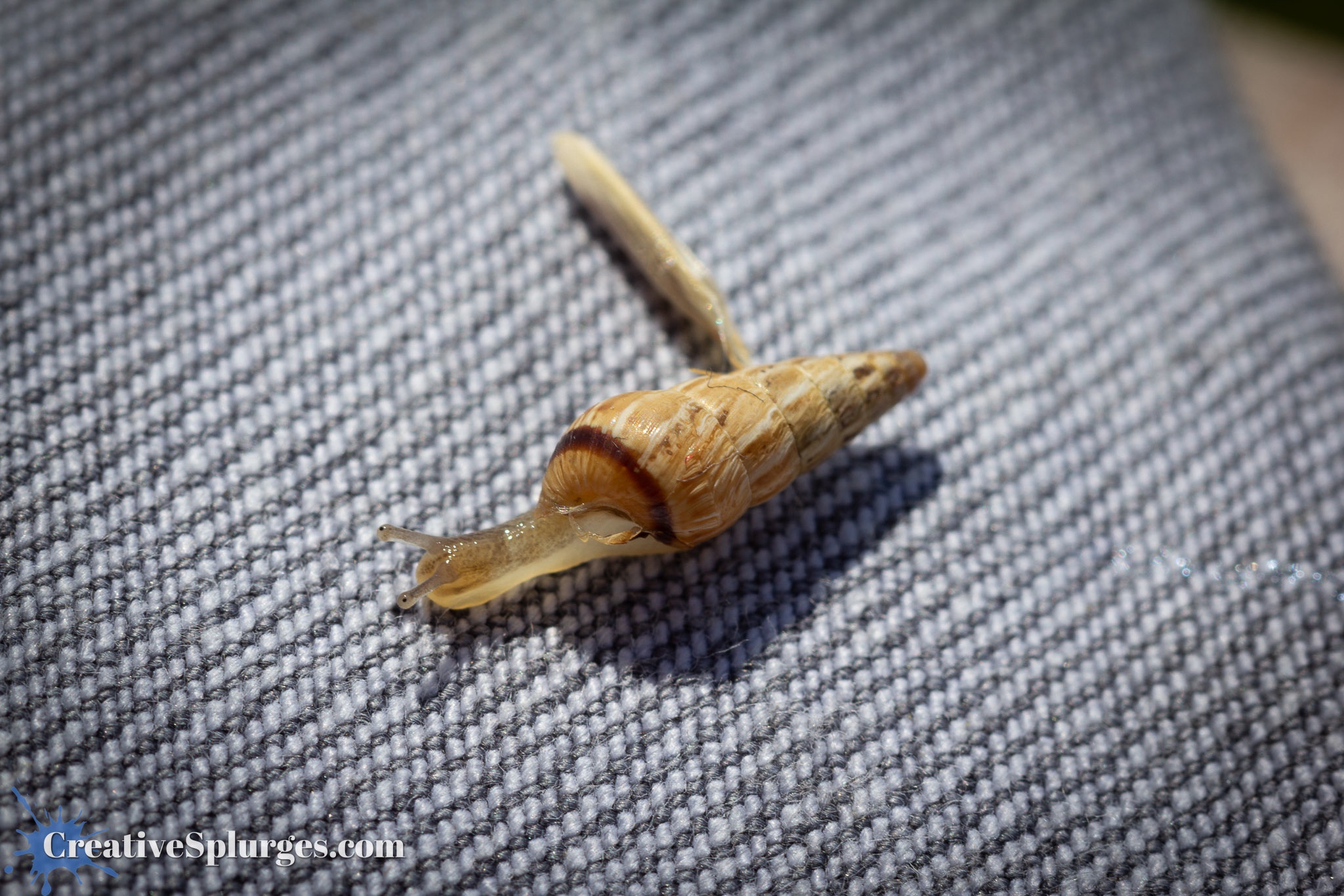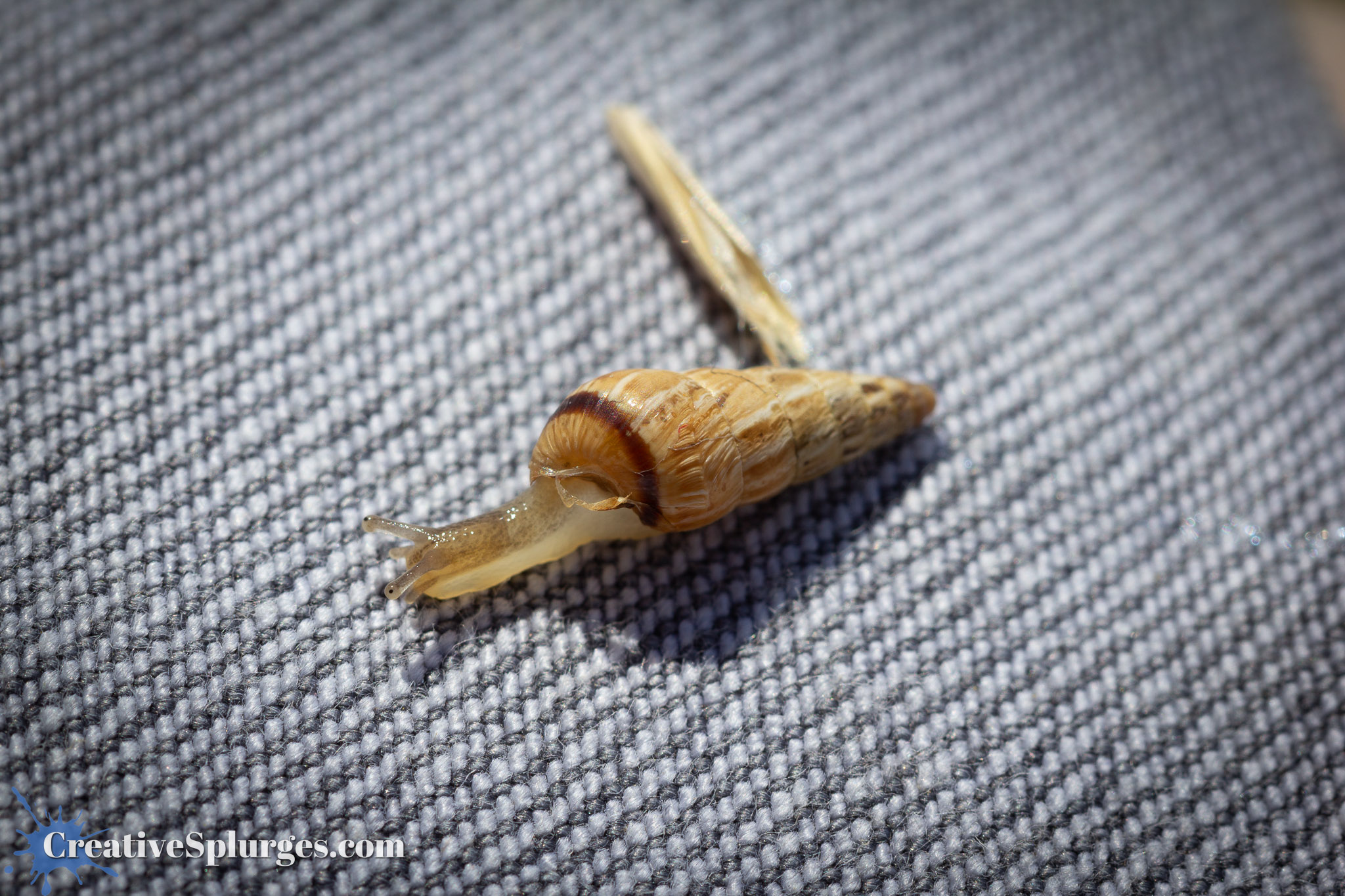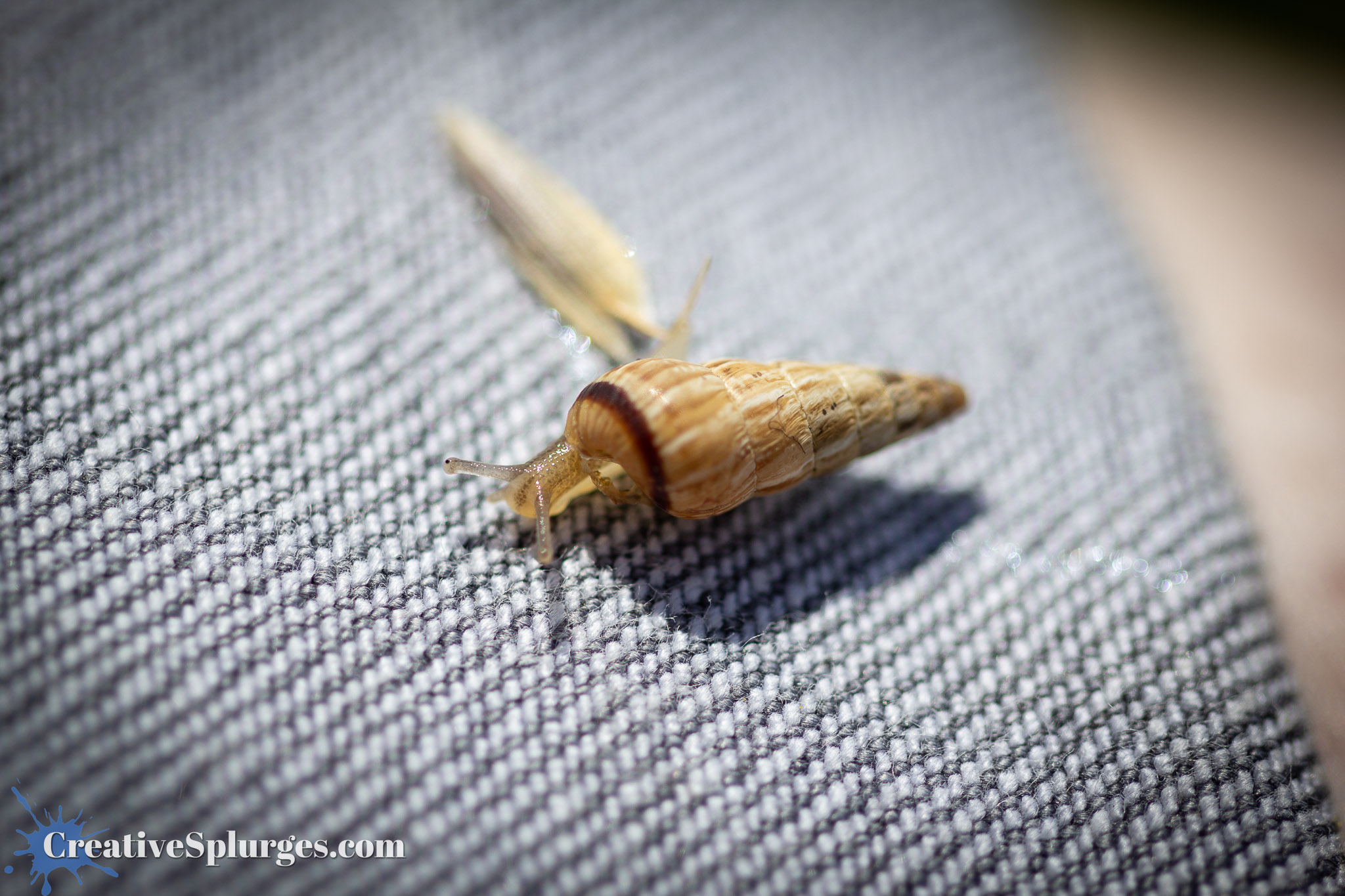 We sat down for lunch, and were greeted by another bit of wildlife: a snail decided to climb up onto my leg and say hello. I broke out my 100mm macro lens for that one.