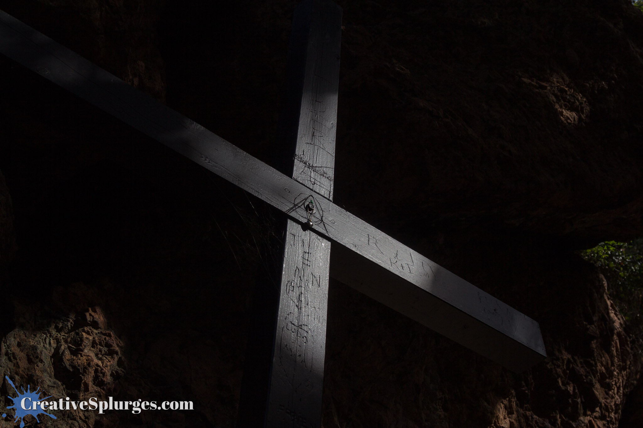 The first thing we saw, pretty much before we started climbing anything, was this cross, catching a shaft of light just right.