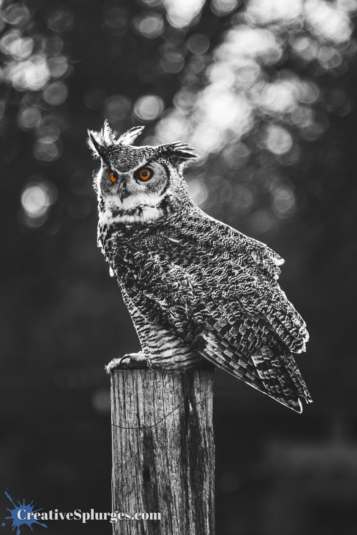 I decided to take this shot and make it a bit more artsy, so I cropped it into portrait, and then tweaked it so it was all a contrasty monochrome, apart from the orange eyes. I bit cliched perhaps, but worth it on this occasion.